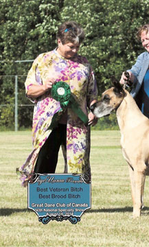 - Best in Specialty Show win at 19 months, Great Dane Club of Canada National Specialty - Best Veteran Bitch and Best Brood Bitch, 2014 Great Dane Club of Canada National Specialty |