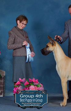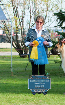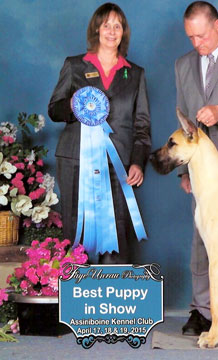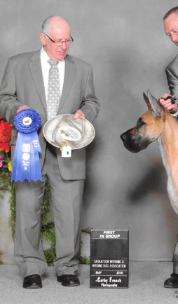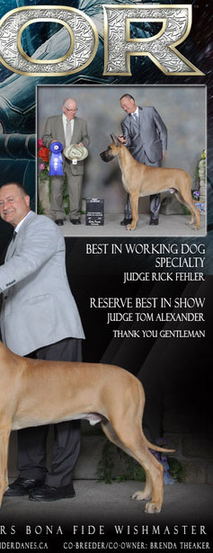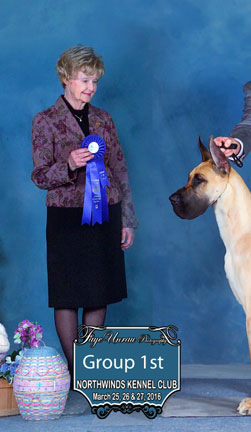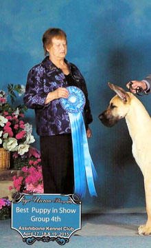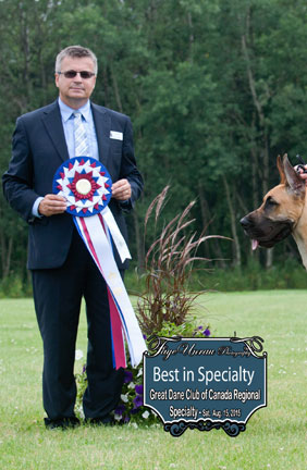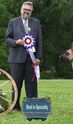 | Show highlights: - #2 Dane in Canada, #1 Owner Handled in 2016 with limited showing - Multi Best in Specialty Show winner - Reserve Best in Show - Multi Best Puppy in Show - Canadian Champion at 10 months |