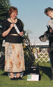 2012 - Completed US Grand Championship at Lake ELmo MB August 2011 - Hawk picked up two 5 point selects both at Specialties towards his Grand Championship title! He finished the weekend with 19 points getting select 4 of the 5 days. August 2008 - Best of Opposite Sex, 2008 GDCC National Specialty Show November 2006 - Finished his American Championship owner handled by Denise. September 2006 - WD, BW Des Moines Great Dane specialty for a 5 pt major owner handled August 2006: - Finished his Canadian championship with a Group 3 and Group 4 wins. - WD for a 4 pt Major at the Heart of Minnesota Great Dane Specialty May 2006: - Best of Winners 3 out of 4 days at the NOWDA Working Dog Specialty show in Thunder Bay. October 2005: - Reserve Winners Male his first time in the ring at 6 months old. |