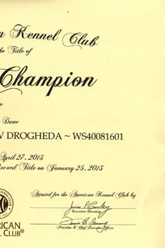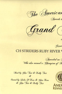 BPIS CH STRIDERS JJ FLASH DROGHEDA x BISS CH STRIDERS MISS KITTY FANTASTICO Breeders: Glen & Kelly Tait Owners: Julia H Kerr, Chris Kerr, G & K Tait OFA cardiac Normal GD-CA3281 OFA Hips Good GD-12414G OFA Thyroid Normal GD-TH2351 Eye Cerf Normal